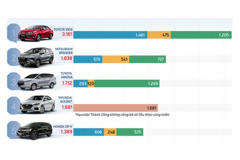 Trong tháng 1 và tháng 2/2019, Honda CR-V giữ vị trí đầu bảng, tuy nhiên, sang tháng 3, Toyota Vios bất ngờ vương lên với con số 3.161 chiếc xe được bán ra. Sau khi vắng bóng ở tháng 02/2019, Mitsubishi Xpander đã quay trở lại bảng xếp hạng đứng ở vị trí thứ 2 với doanh số 1.838 xe, đây được xem là doanh số cộng đồn của các đơn đặt hàng có từ tháng trước vì Xpander đã và đang là mẫu MPV 7 chỗ cỡ nhỏ hút khách trên thị trường.